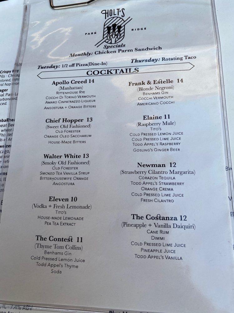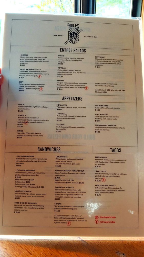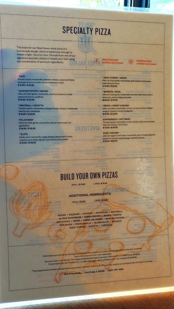 Introducing Holt's, a vibrant American pizza destination located at 43 S Prospect Ave, Park Ridge, IL. Renowned for its casual yet classy atmosphere, Holt's invites diners to indulge in delightful culinary creations that cater to a variety of tastes and dietary preferences. The menu showcases an impressive range of specialty pizzas, including the unique Calamari Pizza and the fan-favorite Taco Toma.